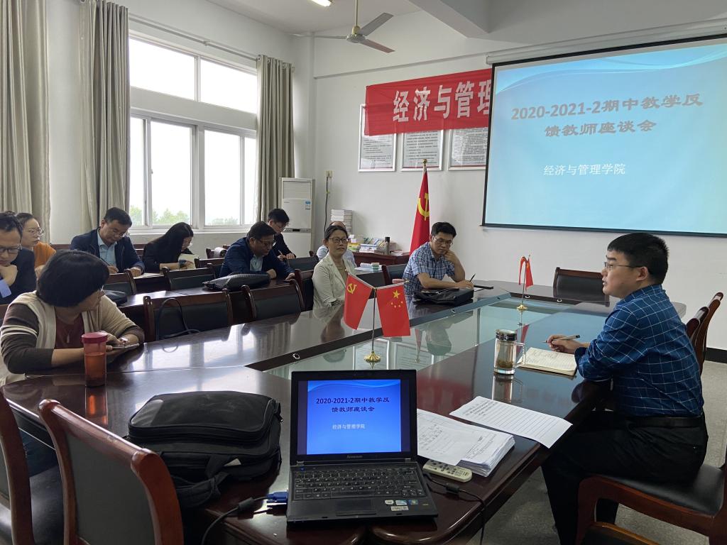 为贯彻落实学校期中教学检查工作要求,进一步推进教学改革,提高教学质量,我院于2021年5月19日下午在龙山校区C楼四层会议室召开了“2020-2021学年第2学期期中教学反馈教师座谈会”。分管教学副院长黄先军、教务员及15名教师代表参会,会议由副院长黄先军主持。