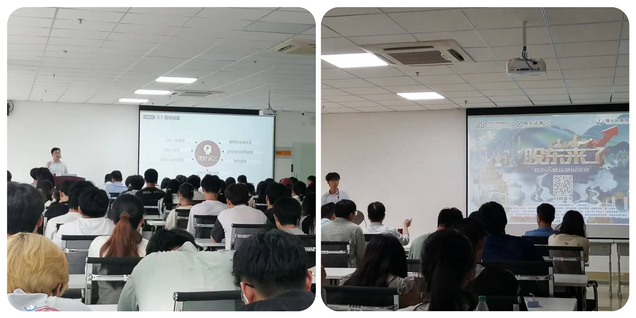 在基地讲解员的带领下,同学们首先参观了基地的展厅。展厅内通过图文、视频等多种形式生动地展现了识别非法集资、反洗钱知识、防范非法证券活动、投资者适当性管理、金融知识普及等相关内容,同学们认真聆听,不时提出问题,与讲解员互动交流,现场气氛热烈。随后同学们参加了由国元证券客户服务部经理姚辉主讲的理财系列知识讲座。老师在什么是理财、金融专业大学生职业规划、证券从业要求等方面进行了深入浅出的讲解。讲座内容丰富,实用性强,深受同学们欢迎。