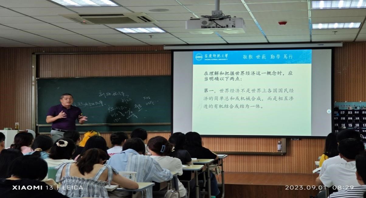 殷老师授课课程为《世界经济概论》,他首先通过引入案例开始,然后重点讲解了世界经济学的研究对象和研究方法,通过问题讨论、案例分析、理论联系实际等方式向同学们进行授课。在授课过程中,殷老师通过将党的二十大精神、中国外交政策、国际分工与专业化、全球化、金砖精神、中国举措、中国倡议等思政元素有效融入教学内容,引导学生树立正确价值观、世界观,培养国际视野,激发学生的奋斗精神、创新热情和爱国情怀。