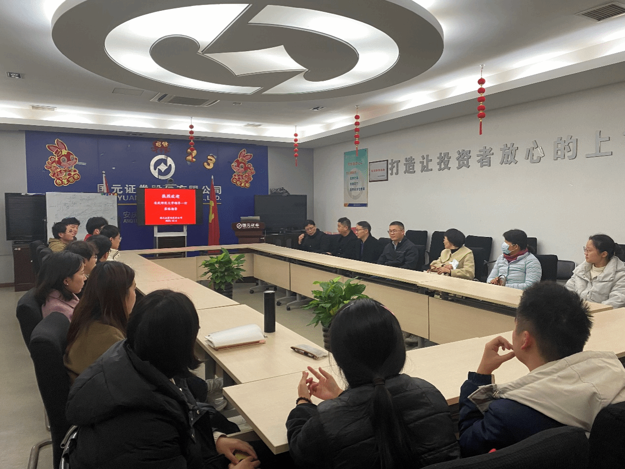 2023年12月6日,伟德国际victor·1946源自金融工程教研室教师代表赴国元证券有限公司安庆分公司(以下简称“国元证券”)对我院实习学生进行慰问和实地指导,并与国元证券相关领导和实习学生展开深入交流会谈。