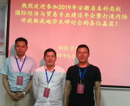 2019年5月25日,2019年安徽省本科高校国际经济与贸易专业建设年会暨打造内陆开放新高地学术研讨会在铜陵召开,本次研讨会由铜陵学院承办,省内外高校经管学院国贸专业教师共50余人参会。我院潘锦云教授、王洪国博士、盛志鹏副教授、殷功利博士应邀参加了会议,会议分两部分。