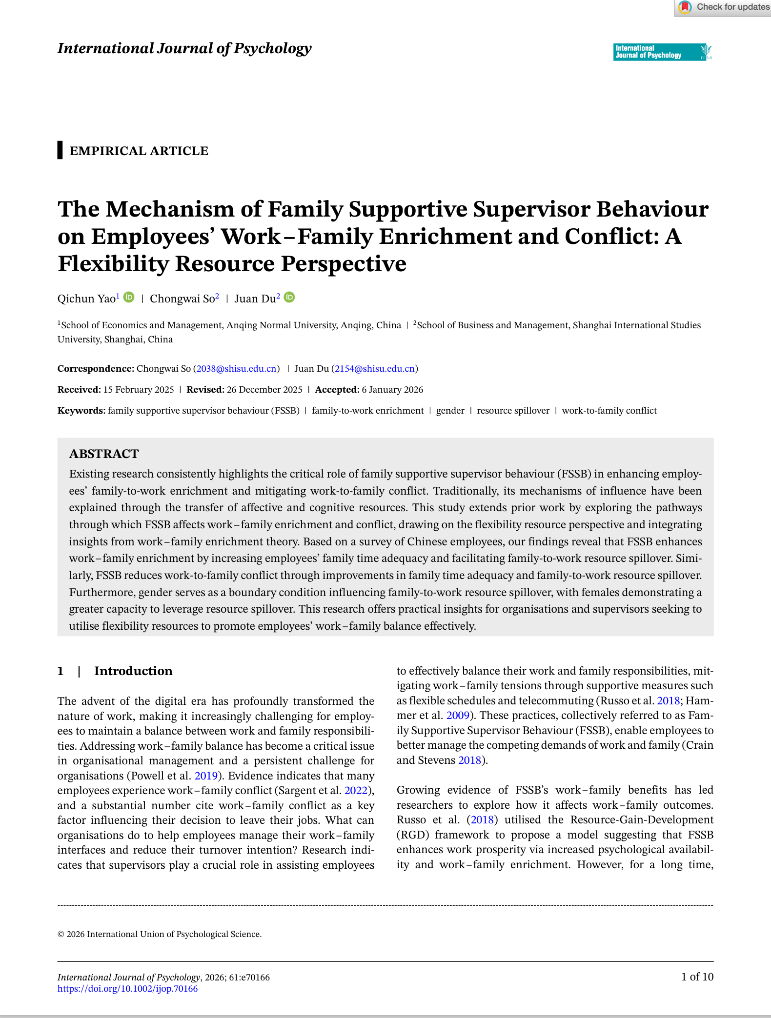 近日,财务管理教研室姚祈春博士以第一作者身份在SSCI期刊《International Journal of Psychology》发表题为《The Mechanism of Family Supportive Supervisor Behaviour on Employees’ Work–Family Enrichment and Conflict: A Flexibility Resource Perspective》的学术论文。《International Journal of Psychology》期刊由Wiley出版社出版,属中科院大类二区、JCR2区期刊。