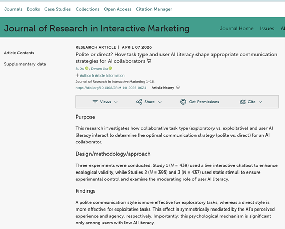 近日,数字营销教研室徐苏博士为第一作者的论文《Polite or direct? How task type and user AI literacy shape appropriate communication strategies for AI collaborators》于《Journal of Research in Interactive Marketing》期刊在线发表。《Journal of Research in Interactive Marketing》系2025中科院SSCI分区二区,2026新锐分区1区TOP期刊,期刊官网显示2024年影响因子为11.06。本文系徐苏博士获批的安徽省教育厅2025年度高校科研项目(2025AHGXSK40253)的阶段性成果。