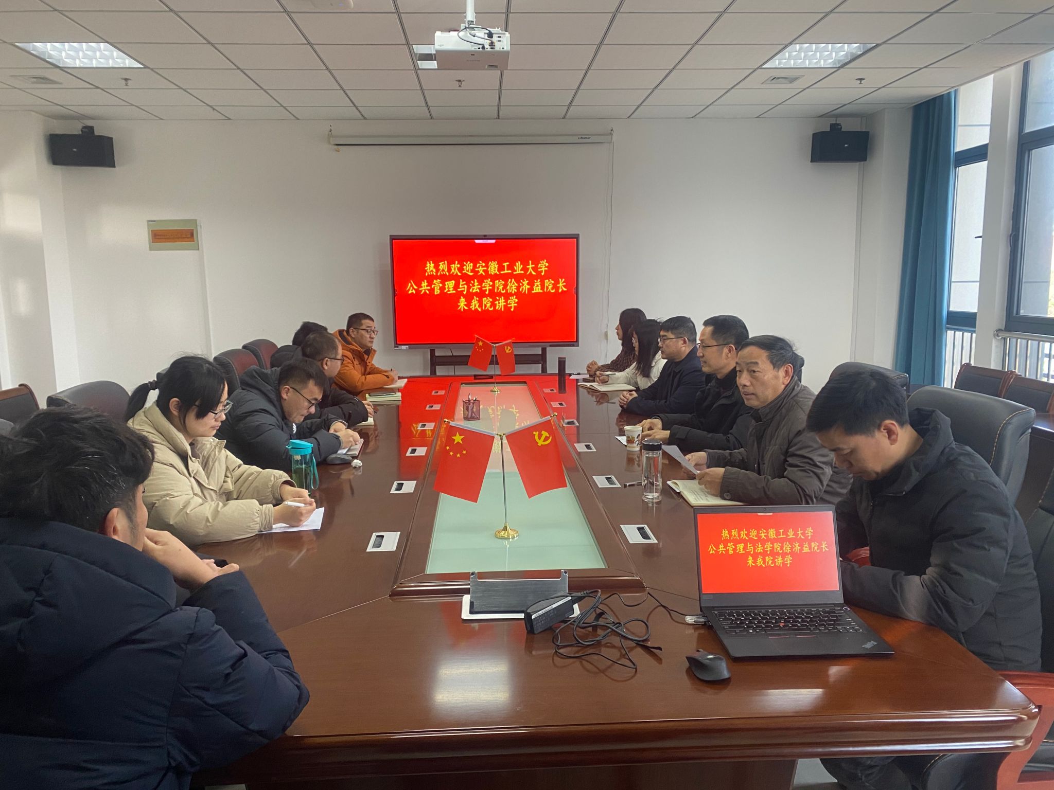 1月15日,安徽工业大学公共管理与法学院院长徐济益教授来到我院交流,并做了题为《管理学科建设及国家基金申报经验与体会》的报告,报告会由杨国才教授主持,学院部分学科骨干和青年老师参加了报告会。
