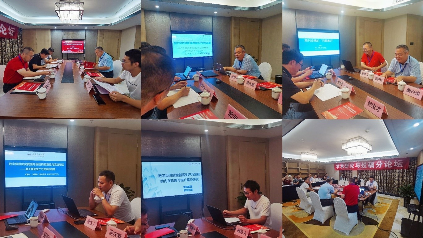 全国国际商务专业学位研究生教指委秘书长、对外经贸大学国际经贸学院副院长、《国际商务—对外经济贸易大学学报》执行主编蓝庆新教授做了题为《助力学术创新,展示高水平研究成果》的报告,浙江工商大学杂志社副社长、《商业经济与管理》和《浙江工商大学学报》副主编郭宝才教授做了题为《期刊投稿的“问题意识”》的报告,我校潘锦云教授、余卫博士以及统计学专业研究生夏宇轩、刘阳分别作了题为《数字贸易优化我国外贸结构的理论与实证研究》《数字经济赋能新质生产力发展的内在机理与提升路径》《人工智能发展影响经济伦理失范的理论与实证研究》《科技创新如何促进种植结构“驱粮化”——农业新质生产力视角》的交流汇报。