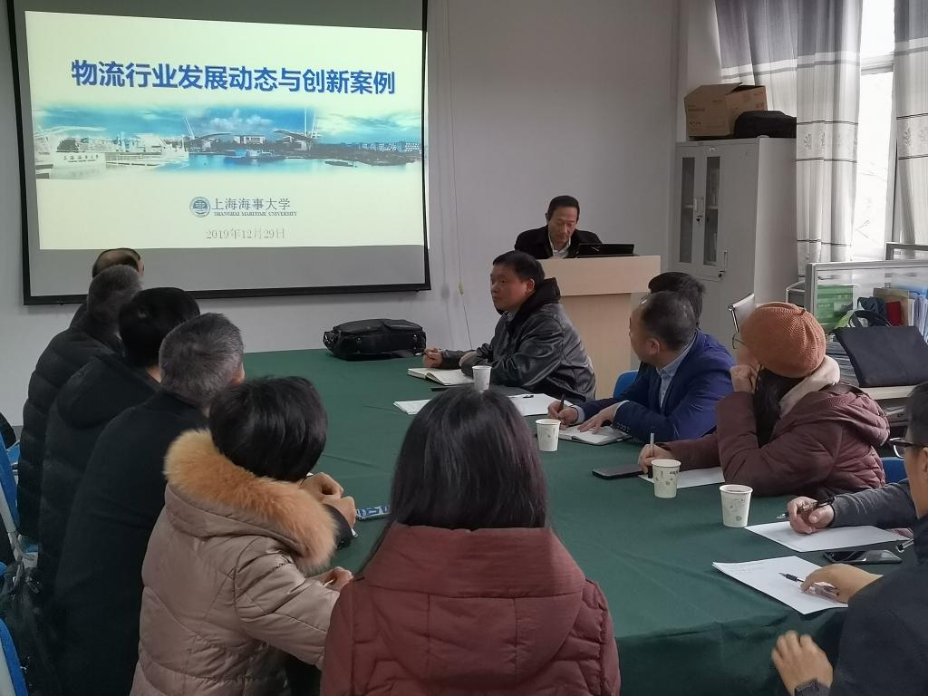 12月28日,教育部新文科建设工作组副组长、教育部物流类专业指导委员会主任、上海海事大学校长黄有方教授应邀前来我校指导学科与专业建设,校长闵永新教授、副校长汪时珍教授接见了黄教授,并就新文科建设、物流管理学科与专业建设、校际交流合作等方面展开了深层次的交流和探讨。次日上午,在菱湖校区MBA教室黄教授为我院教师作了主题为“物流行业发展动态与创新案例”的学术报告,报告会由院长杨国才教授主持,我院物流专业所有教师以及各专业负责人聆听了讲座。