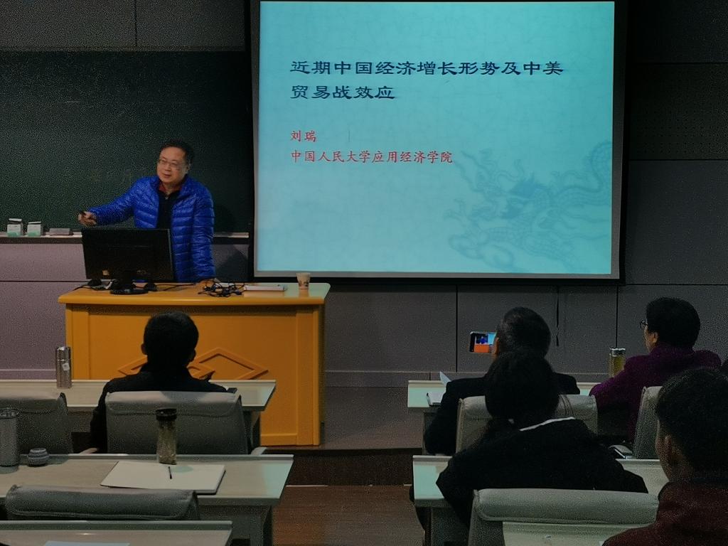 12月13日上午,中国人民大学应用经济学院刘瑞教授(博士生导师)应邀前来我院讲学,为我院研究生、17级国贸、18级金融举办了题为“近期中国经济增长形势及中美贸易战效应”的学术讲座。讲座由院长杨国才教授主持,部分教师参会聆听了报告。