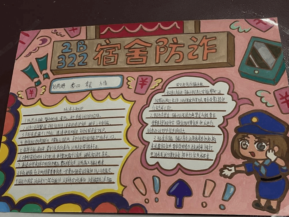 在寝室设计中,参赛者以宿舍为单位,绘制了以反诈为主题的手抄报。他们将专业特色、生活品位、性格特点以及自身理想追求融入寝室设计之中,体现了寝室氛围对大学生成长的重要作用。参赛者们积极发挥创造力和动手能力,共同打造了“干净、整洁、和谐、向上”的寝室文化,积极打通学校反诈宣传教育的“最后一公里”。(撰稿:孙成成 李小露 摄影:李小露 宋欢 审核:周毅)