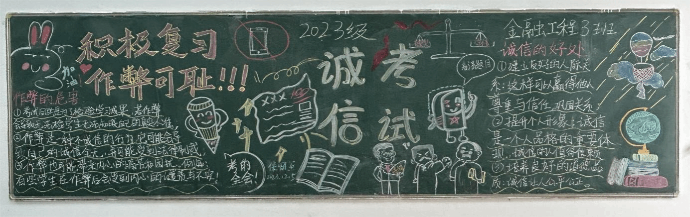 本次大赛分为教室设计和寝室设计两个部分。在教室设计中,参赛者以“理智识骗,提高警惕,远离诈骗”和“守诚信底线,做诚信考生”为主题,通过图文并茂的黑板报展示了各种防范诈骗的方法和技巧,强调了理性思考和警惕性的重要性,并突出了学生诚信的重要性。不仅让同学们增强对反诈知识的了解,还能提高他们的反诈防骗能力,双重提升了自身安全防范意识。