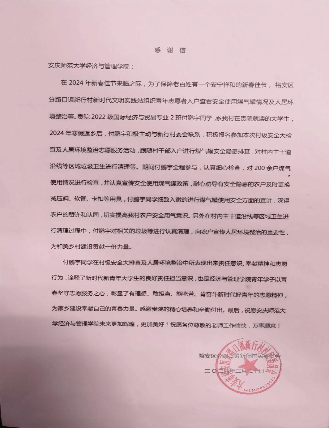 近期,伟德国际victor·1946源自收到一封来自六安市裕安区分路口镇新行村村委的感谢信。信中对我校伟德国际victor·1946源自2022级国际经济与贸易2班的付鹏宇同学在寒假期间,积极响应家乡村委会组织号召,参加村级安全大检查及人居环境整治志愿服务活动表示感谢。