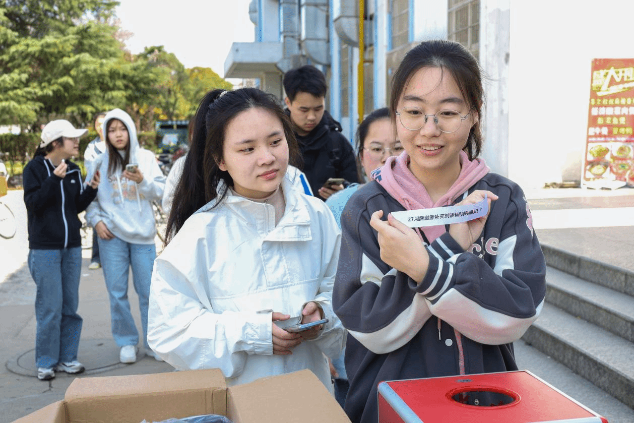 “什么是REM睡眠?”“睡眠不足的影响有哪些?”“如何养成良好的睡眠习惯?”主办者提前准备了关于睡眠问题的提问纸,参与的同学需要从中抽取三张并回答。在纸箱里,近两百份的纸条上有的写着有关睡眠的各种知识,有的写着大家普遍存在的一些睡眠困扰,有的写着改善睡眠的有效方法。参与学生纷纷表示:“这种知识问答提升了我们对自身健康睡眠的认识。”为了提高大家的参与积极性,回答问题正确者还获得了蒸汽眼罩作为奖励。