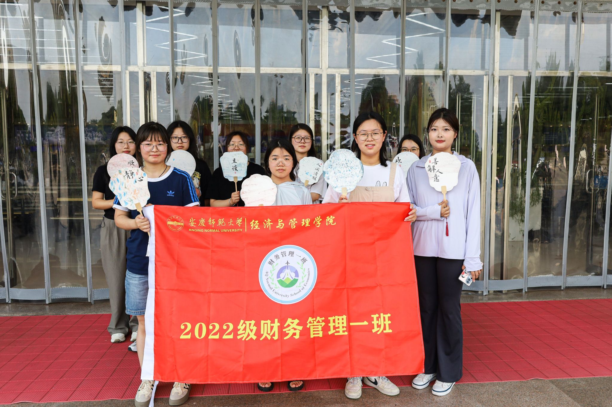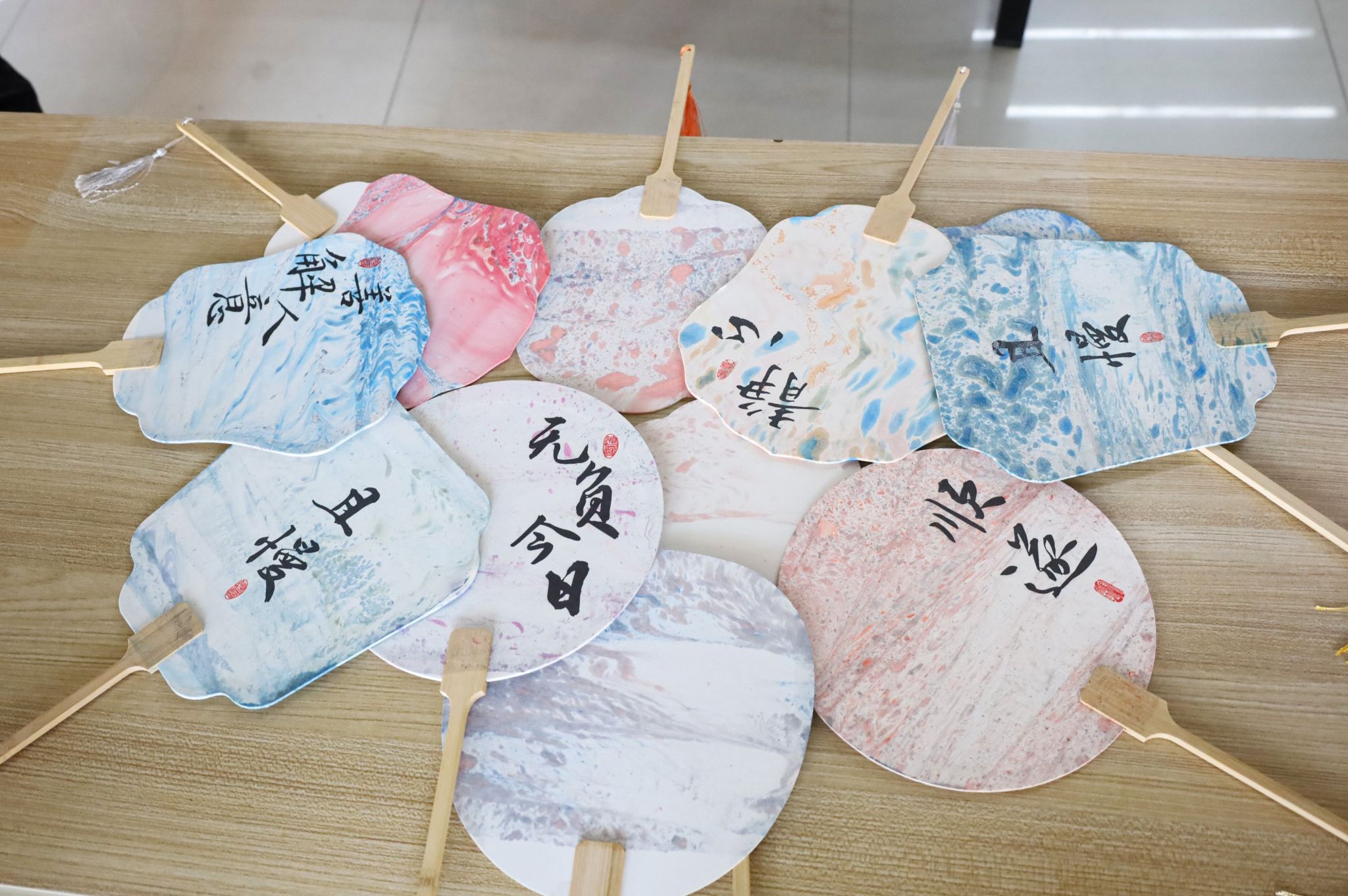 石青天蓝点点交融,月白蕊黄纵横交织,粉红淡紫相映成趣……5月25日,伟德国际victor·1946源自财务管理专业2022(1)班、2022(3)班全体学生在西苑食堂二楼共同举办了主题团日活动——非遗漂漆扇体验,他们以漆为笔,以水作画,在扇面上绘制创意画作。