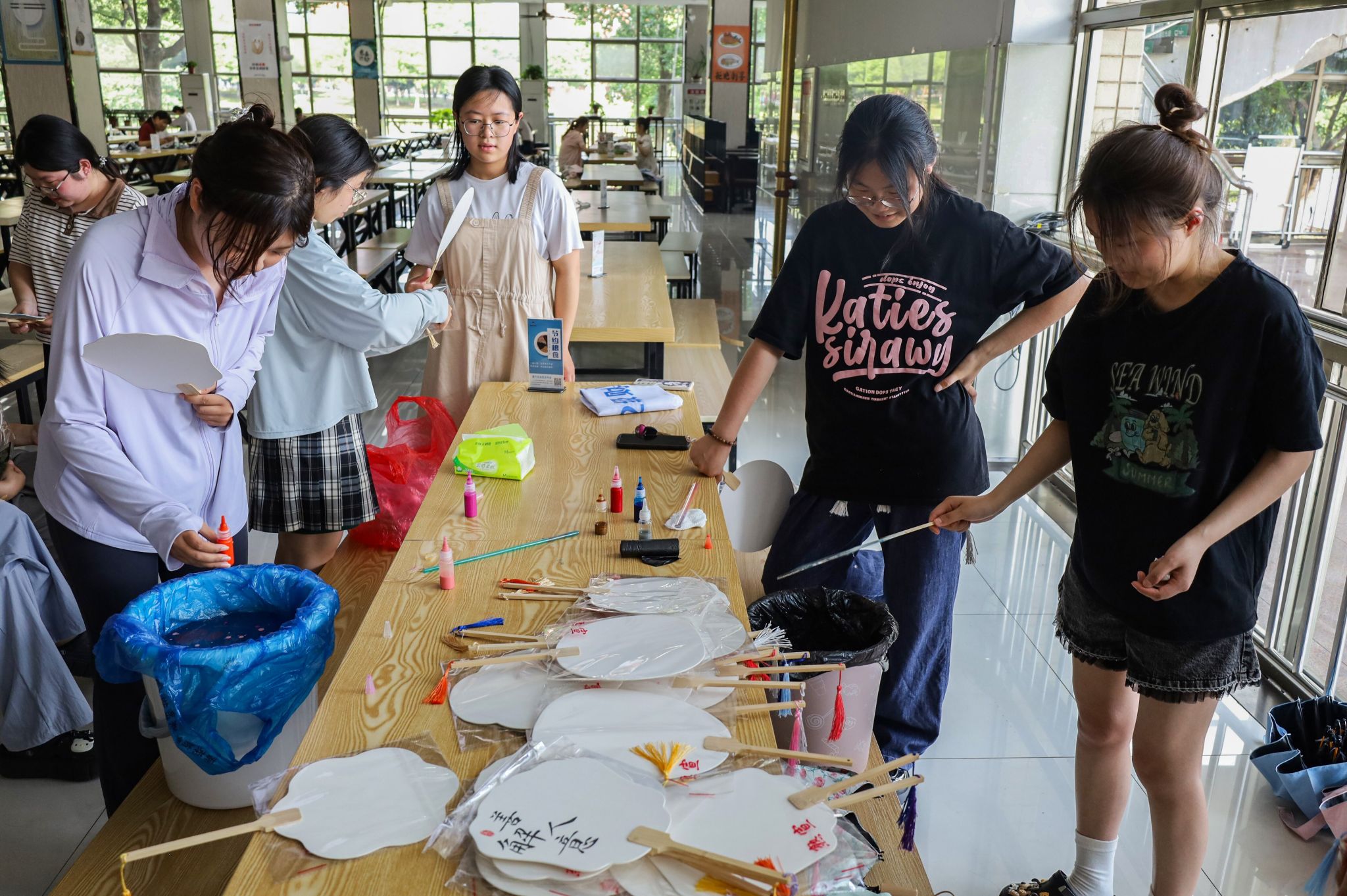 调漆、推漆、稀释、点漆、拉花……在漆扇的制作过程中,每一个步骤都至关重要。听完汪子奇的介绍后,同学们跃跃欲试,纷纷表示要亲自体验制作。同学们提前找好色卡,小心翼翼地对照着进行调漆,DIY出自己心仪的色彩搭配。他们将空白的扇子缓缓放入漆桶,或旋转,或轻摇,不同颜色的色漆在扇面汇聚交融,一把把绚丽多彩的漆扇就此呈现。