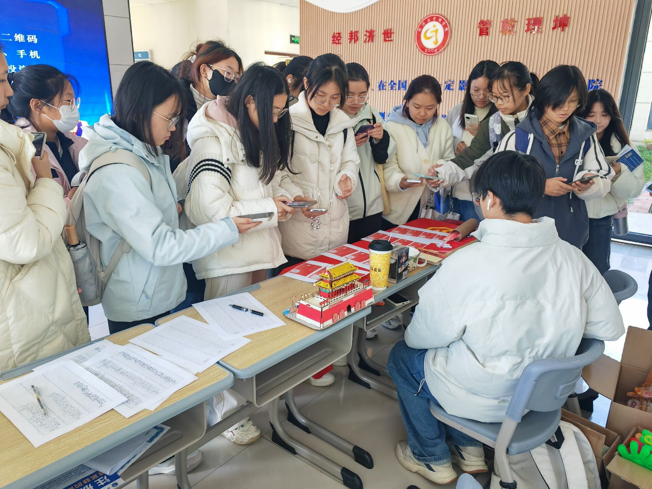 活动当日,协会成员们设置了多个宣传海报和易拉宝展示着天柱山的壮美景色,吸引了众多师生驻足围观。活动现场,进行扫码关注小红书抽奖活动。同学们扫码关注小红书账号,即可抽奖赢天柱山门票等惊喜大奖。这一简单而有趣的互动方式,极大地激发了同学们的参与热情,也让同学们对安庆文旅的代表景点天柱山有了更深的了解。