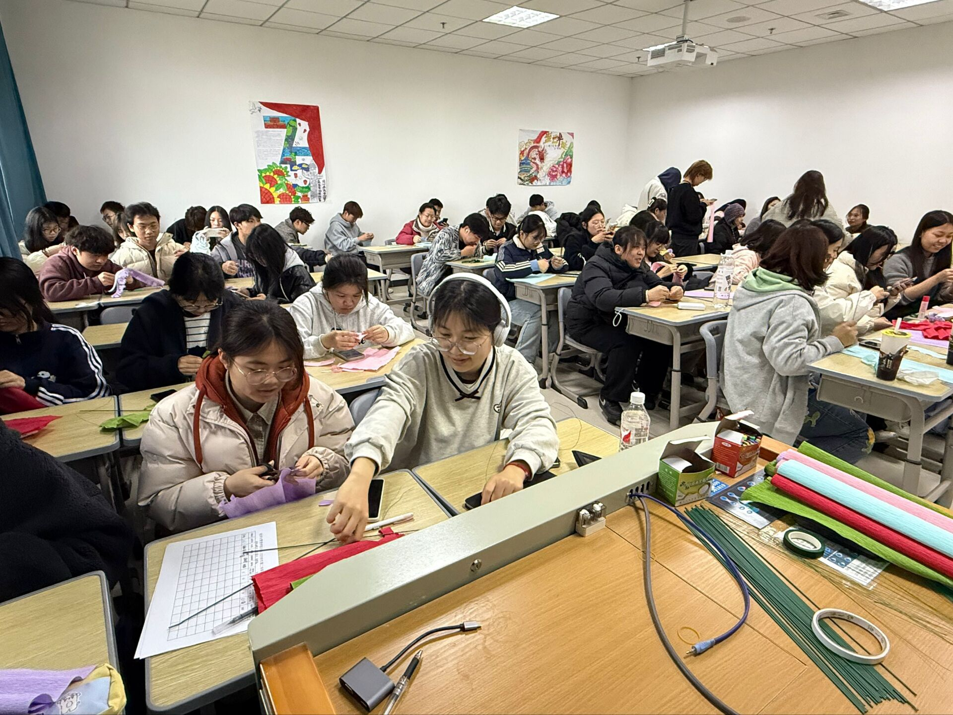 活动开始,同学们利用皱纹纸、花杆、胶水等材料,认真制作玫瑰花束。从裁剪花瓣到组装花枝,大家相互协作,精心修饰每一处细节,力求将最美好的祝福融入每一朵玫瑰中。活动现场气氛热烈,欢声笑语不断,同学们在实践中感受着劳动的快乐和团队协作的力量。随后,同学们分成小组,带着亲手制作的玫瑰花束,前往食堂、宿舍楼等地,将玫瑰赠予食堂工作人员和宿舍管理员,向他们表示感谢。
