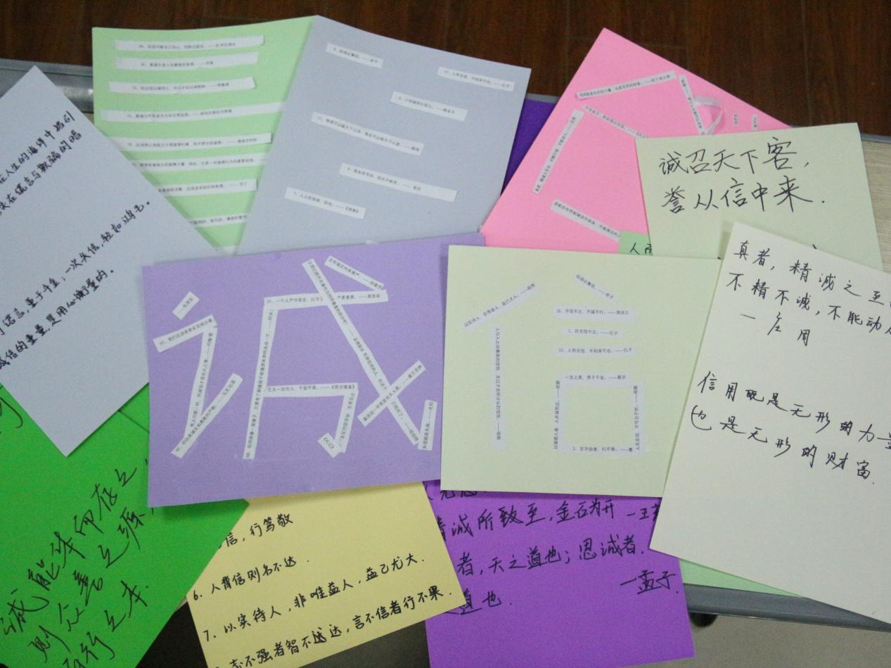 在“诚信拼贴诗”活动中,同学们以彩色卡纸为创作载体,从预先准备的诗句库中挑选与诚信相关的词句,通过精心的剪贴、排版创作出个性化小诗。在创作过程中,同学们不断思考诚信的内涵,更深刻地认识到诚信的重要性,诚信意识得到显著提升。