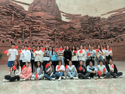 参观结束后,孙芮给同学们分发了国旗和国旗贴纸,同学们纷纷手举国旗,脸贴国旗贴纸,拿出手机拍下了与国旗的合影。“我和我的祖国,一刻也不能分割……”,合影结束后,在孙芮的带领下,同学们共同唱起《我和我的祖国》,大家挥舞手中的国旗,放声高歌,共同祝福伟大祖国的73周年华诞。