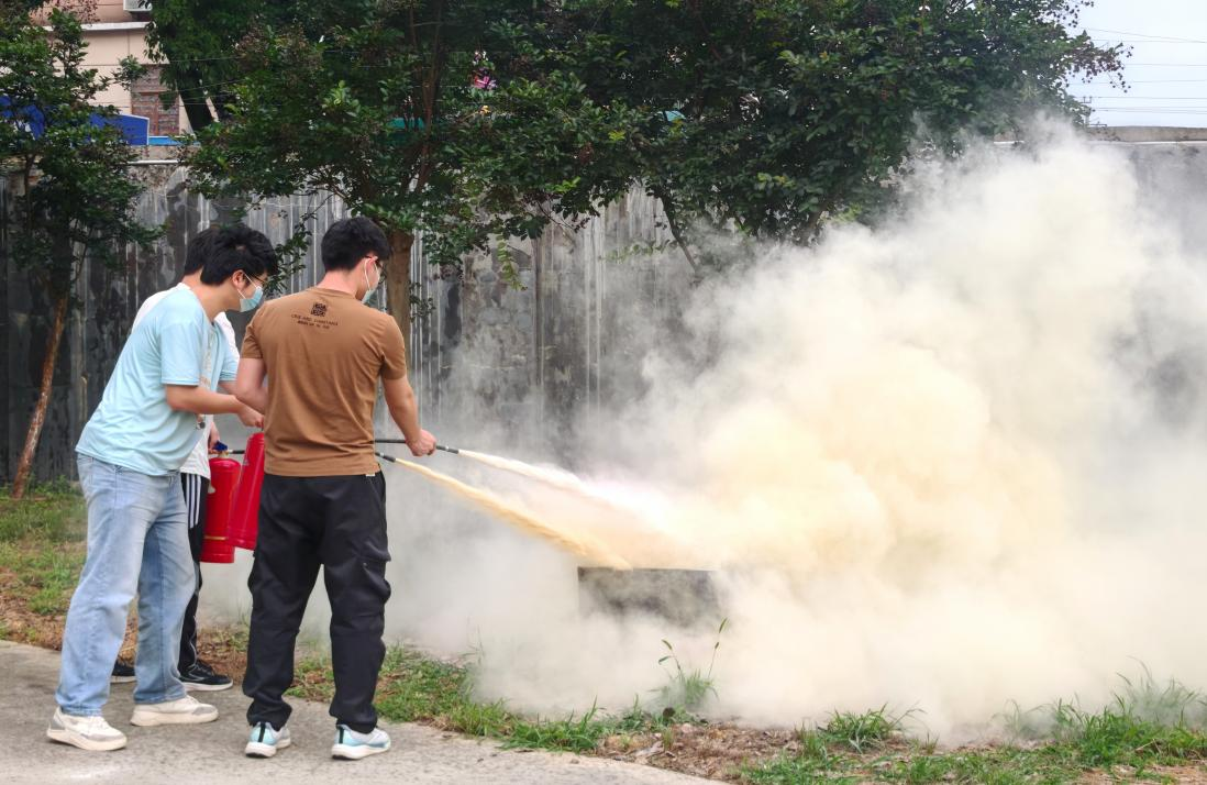 案例讲解后,实践环节也随之开展。参与同学在老师指导下,亲身操作灭火器与水枪进行灭火。从拔保险销、对准火源到按压把手、精准喷射,同学们认真演练。
