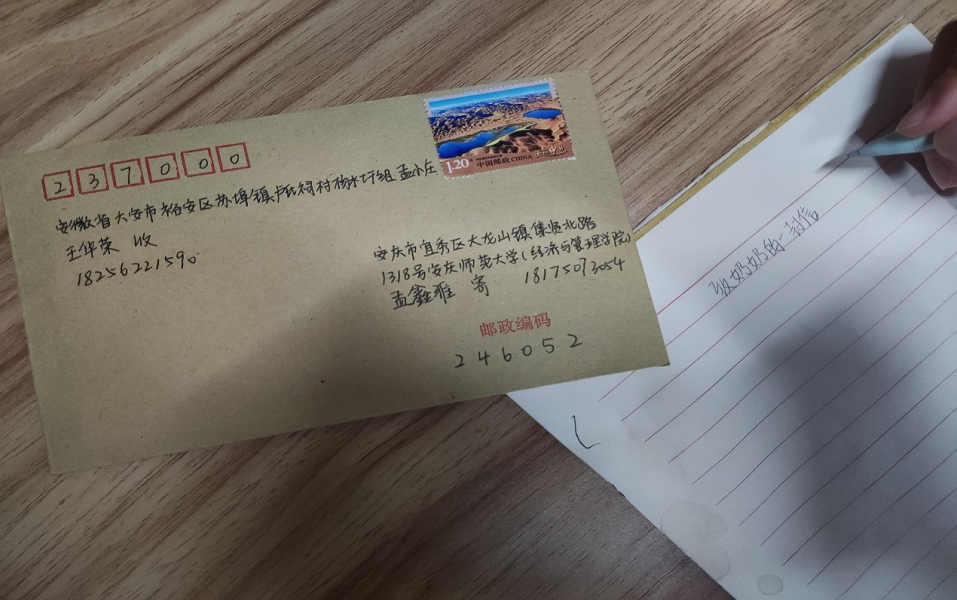 “我给奶奶写了很多心里话,让她不要太牵挂我,还有我对她的中秋节祝愿。”2021级财务管理专业(2)班孟鑫雅同学从前都是和奶奶一起在家过中秋节,她认为手写书信这种传统的交流方式相对于平时的手机短信和微信消息让老人家更方便接受,想到独自在家过节的奶奶,孟鑫雅同学感到十分牵挂,希望这封信能让奶奶过一个暖心、放心的中秋节。