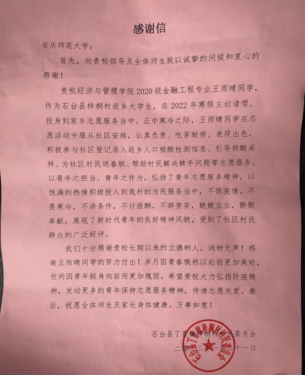 1月26日,我院收到一封来自池州市石台县丁香镇梓桐村村民委员会的感谢信。信中介绍了2020级金融工程专业王雨晴同学主动与抗疫志愿服务的先进事迹,并对我校培养出“不惧疫情、不讲条件、不计报酬、不辞劳苦”的优秀大学生表示称赞。