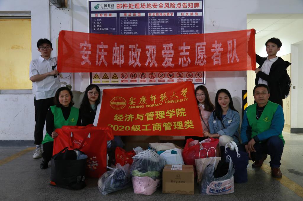80本笔记本, 40多件衣物,34支签字笔,还有若干书籍、生活用品、文具……它们摇身一变,化作爱心包裹将被送到安徽太湖百里镇。3月26日下午,李薇等人代表bv1946伟德工商管理专业2020级全体学生,将250余件物品在安庆市雷池路邮政所寄出。