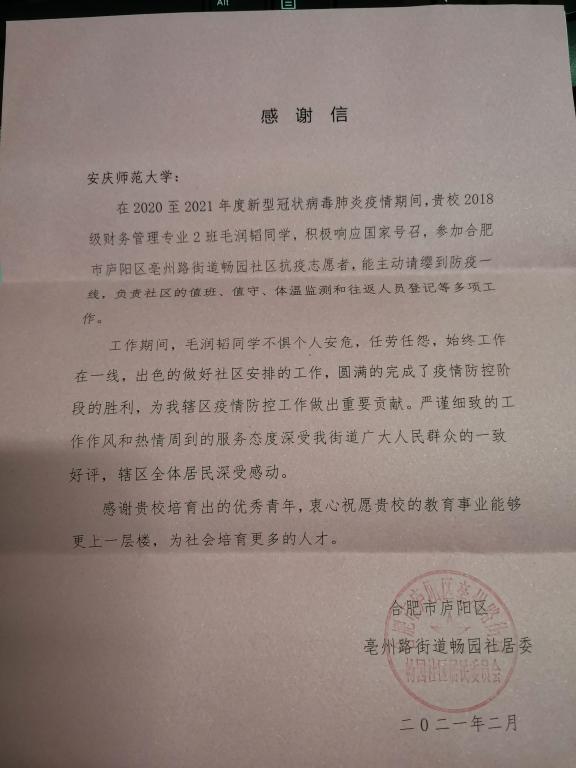 义务劳动、无偿献血、扶贫支教……毛润韬平时也经常参加一些志愿服务工作,面对疫情,他一直想出一份力、贡献一份力量。每当在新闻中看见那些“抗疫勇士”们的故事,总能令他感动不已,也更加坚定了他要去做志愿的决心。“志愿服务平凡而光荣,作为一名青年大学生,我有责任和义务献出自己的爱心和热血,去帮助和挽救他人的生命,向社会展现出当代青年人的风采。”他说。(学生记者:张忍龙,审核:贺卫)