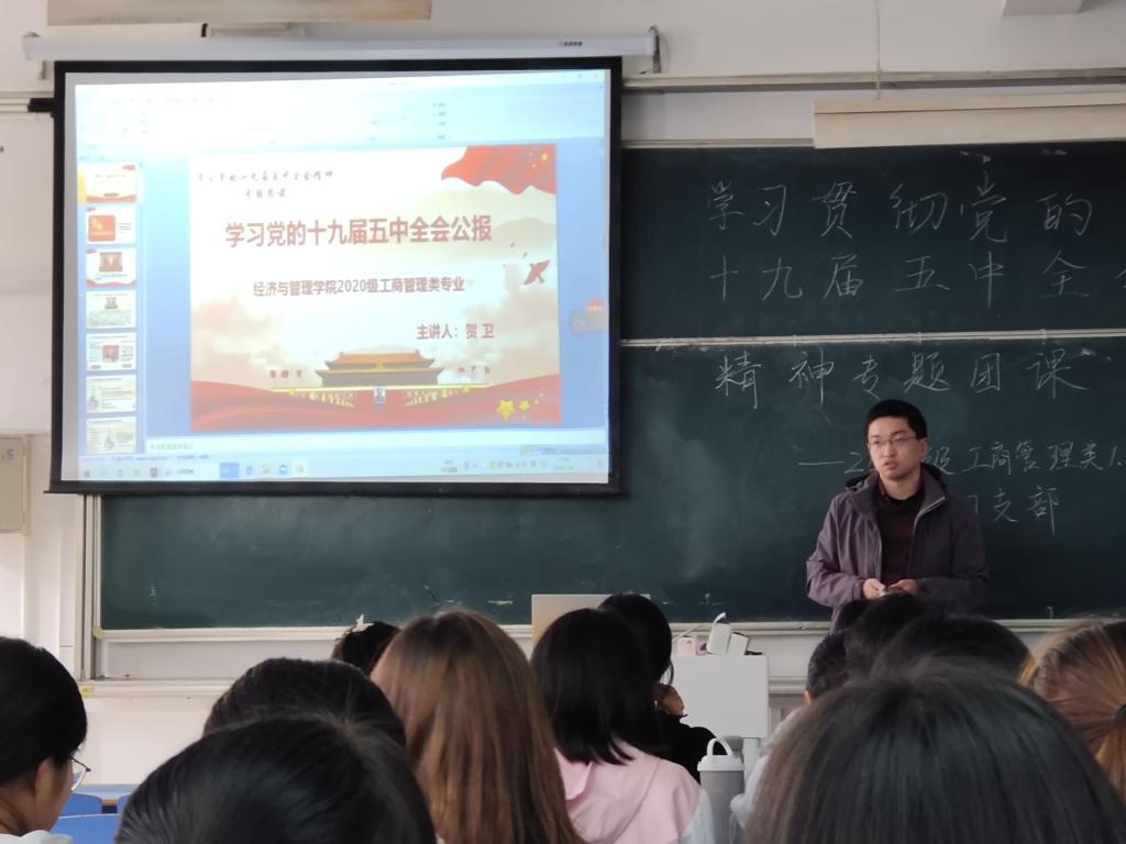 为了提高新时代青年大学生的思想政治素养,培养青年学生的使命感、责任感与家国情怀。2020级工商管理一班、二班团支部于2020年11月4日上午联合组织开展了学习贯彻党的十九届五中全会精神专题团课学习,学院教师兼职团委副书记、辅导员贺卫老师领学并担任本次团课主讲,2020级工商管理类专业全体同学参加学习研讨。