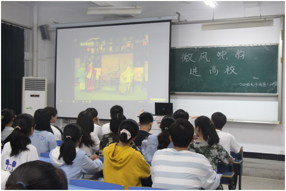 影片中的演员们用他们专业的唱腔,精彩的演绎了经典名著—《红楼梦》,将传统的黄梅戏与古代经典小说相结合,呈现出更好的效果,同学们都沉醉在优秀的戏剧中。当然,还有很多其他的优秀戏曲剧目,如黄梅戏《天仙配》、黄梅戏《卖花记》、淮北梆子戏《穆桂英挂帅》等等,每每精彩之处便引来同学们热烈的掌声。