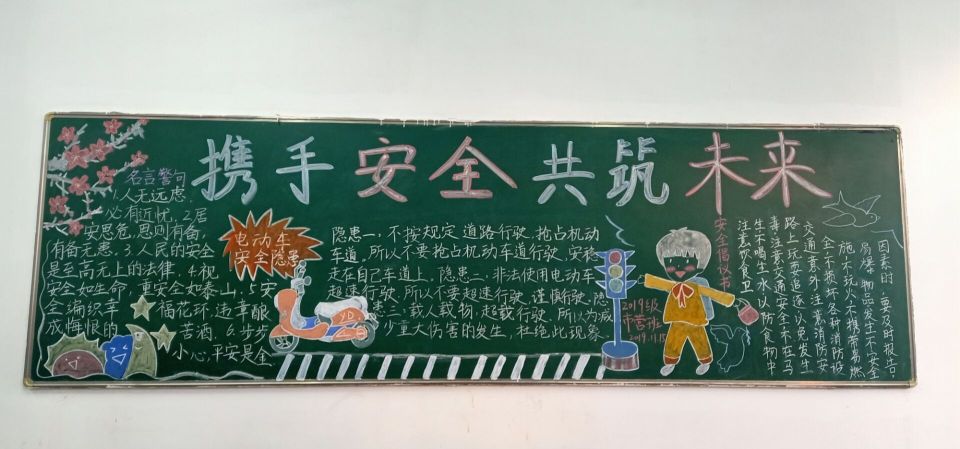 本次比赛分为主题黑板报和安全教育主题班会设计评选两个环节。在黑板报比赛中,同学们对黑板报进行了精心地设计,多角度地宣传了交通安全、金融安全、食品安全、用电安全、网络安全等知识。主题班会评选中,同学们通过分析身边安全隐患案例,尤其是学生骑乘电动车存在的安全隐患问题,说明了学生加强安全防范意识的重要性,提醒同学们遵守学校安全规章制度,强化安全意识。