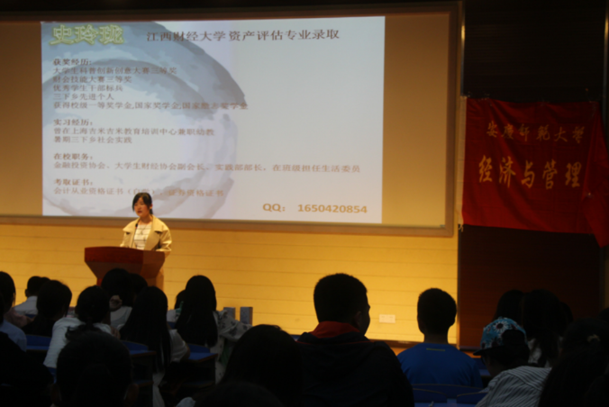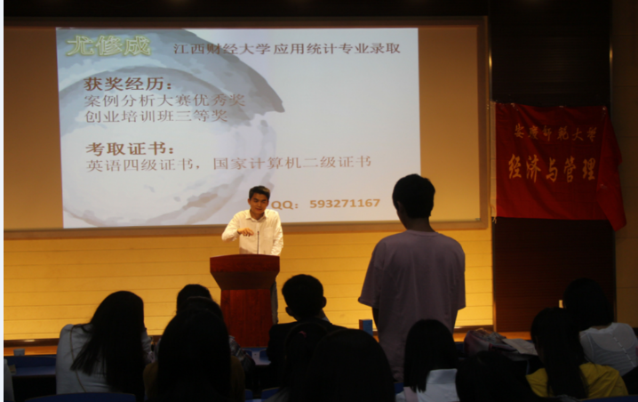 全会由“交流共享”和“现场提问”两个环节组成。在交流会上,考研取得优异成绩的几位同学从自身考研经历出发,围绕如何选取专业和院校、制定复习计划、调整心态以及复试中的注意事项等方面谈了自己的亲生体验和感受。考取河海大学研究生的闵崇智以风趣幽默的语言结合自身经历向同学们简单讲述了各学科学习的方法和建议,他说到“学习更注重的是基础和细节,在考场上,它就像是我们的武功秘籍”。考研贵在坚持,贵在踏实,他告诫经管学子们唯有努力,超越自己,才能打破生活的不公平。开门见山的说话风格,清晰的逻辑思维赢得了在场观众的阵阵掌声。到会的其他几位考研取得优异成绩的同学也就复试技巧等方面与同学们交流了自己的考研感受。其中,考取江西财经大学研究生的史玲珑就“如何调整考研时的心态”和“如何不断尝试,准备考研”两个方面的详细解答让在场学子们受益匪浅。