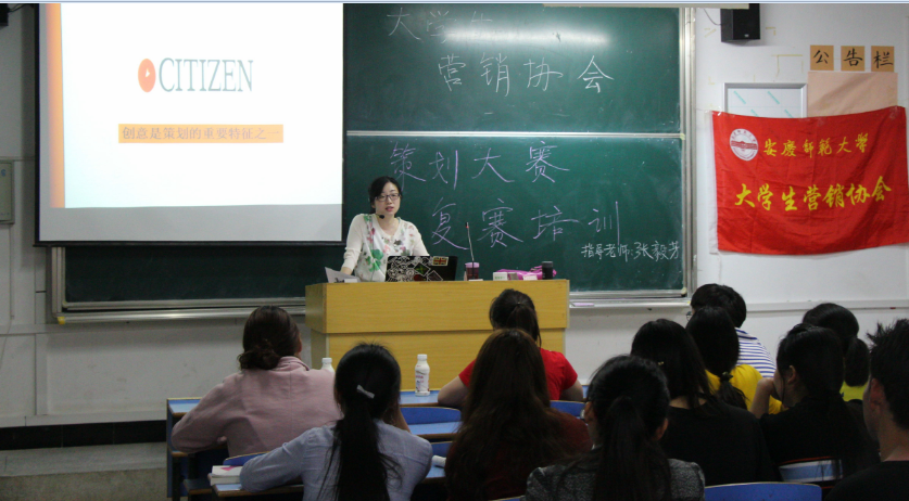 会议伊始,张毅芳副教授上台为大家进行指导,首先她认可了各队在初赛中的出色表现并表达了对复赛及决赛的期待,同时就策划是什么、策划书包括什么、如何完成一份优秀的策划书等问题进行了充分的讲解,她说“我们要明确策划的目的,研究产品的特点和竞争对手,明确产品卖点,策划应做到有创意、有目标、有可能。”其中,张老师通过对福特汽车公司销售“野马”汽车,万宝路香烟如何实现从女性香烟转型为男性香烟等实际案例的举证分析,清晰明了的从市场分析,市场定位等方面为大家进行了指导。随后,财务管理专业赵雅倩上台进行发言。赵雅倩同学首先就现场情况有感而发创作了一首顺口溜,赢得全场掌声,活跃现场气氛。紧接着她总结了自己队伍的比赛经验,强调了团队合作的重要性,并分发了策划书样本供大家参考学习,提出“比赛中会经历很多,也会收获很多,这其中团队的协作至关重要,队伍间要明确分工,共同努力。”最后,大学生营销协会会长李厚雪上台对大家的到来表示欢迎,他对各队在初赛中获得的优异成绩进行了赞赏并发放了奖金奖励,并对复赛规则进行说明,作总结发言,培训大会在掌声中落下帷幕。