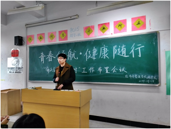 近期,学院团总支召开了大学生修身教育实践活动项目“青春领航健康随行--每天锻炼一小时”布置会。学院团总支学生骨干、班长、团支书参加会议。团总支学生书记常磊主持会议。
