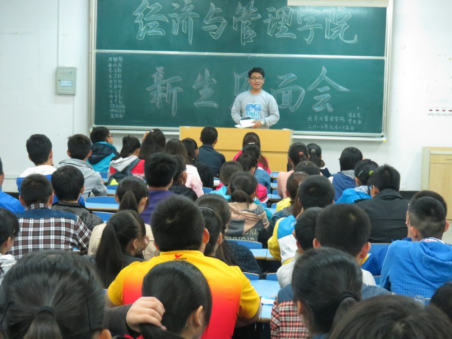 学生会主席余以坤首先对新生的到来表示了热烈欢迎,欢迎广大新生加入经管院这个大家庭,更多了解学生会并更好的融入大学生活。”实践部的“赢在起跑线,在大一就优秀起来”、学习部的“不要忘记学习,抓住每一分每一秒”、体育部的“热爱体育,享受生活”、宣传部的“拥有服务同学的心,发现生活中的美好”,纷纷赢得了同学的热烈反应。
