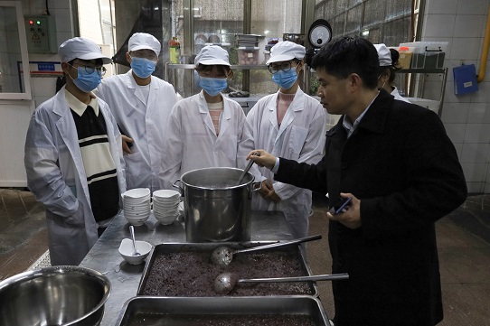 将洗净的红豆放入蒸箱,蒸至熟烂软糯,再捣碎碾成红豆泥,加入清水后反复搅动。添加小汤圆、黑米糊、酒酿大火熬制,起锅时加入淀粉勾芡。历时近两小时,200余份红豆糊熬制而成。11月23日,距离考研还有近一个月的时间,在西苑食堂后厨,伟德国际victor·1946源自的同学们在食堂工作人员的协助下,动手参与制作红豆糊,为考研的学长学姐们助力。