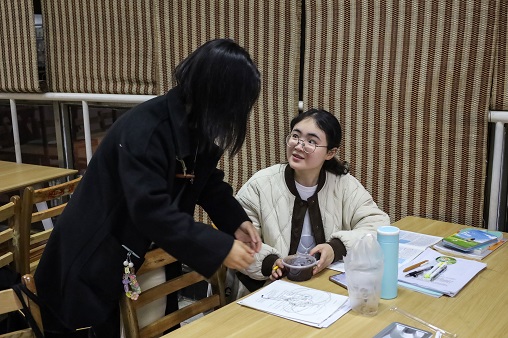 同学们还将写有寄语的明信片和红豆糊送进室内,走到还在认真复习备考的学子身旁,轻声唤着“考研加油”,并将一碗碗红豆糊放置在桌面。考研学子们双手端起红豆糊认真品尝,为学弟学妹们的贴心服务“点赞”。体育表演专业2018级的方慧正在准备二战,学弟学妹们的祝福让她深受感动。她表示:“学弟学妹的出现让我倍感美好。同时我想对自己说,有努力就会有回报!”
