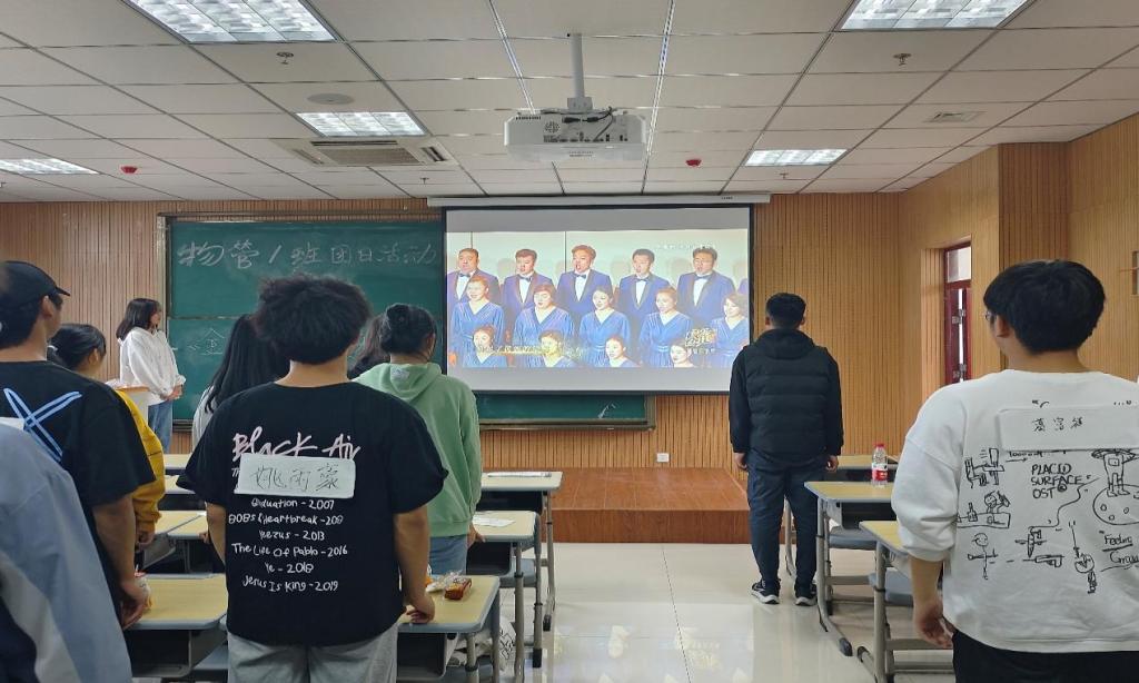 第一部分,在M304教室,全体同学起立奏唱团歌,用欢快的歌声表达对祖国的热爱;随后,团支书顾欣怡带领全班同学朗读了习近平总书记在党的二十大报告中关于青年工作的内容,“当代青年不仅是新时代发展成果的直接受益者,也是新时代伟大斗争的直接参与者,经过洗礼展现出自信自强、刚健有为的良好风貌……”。充分展示了同学们的蓬勃朝气和奋进力量,也激励着同学们牢记初心使命,勇担时代责任,将小我融入大我,青春献给祖国,用青春和汗水谱写出中华民族伟大复兴的中国梦新篇章!