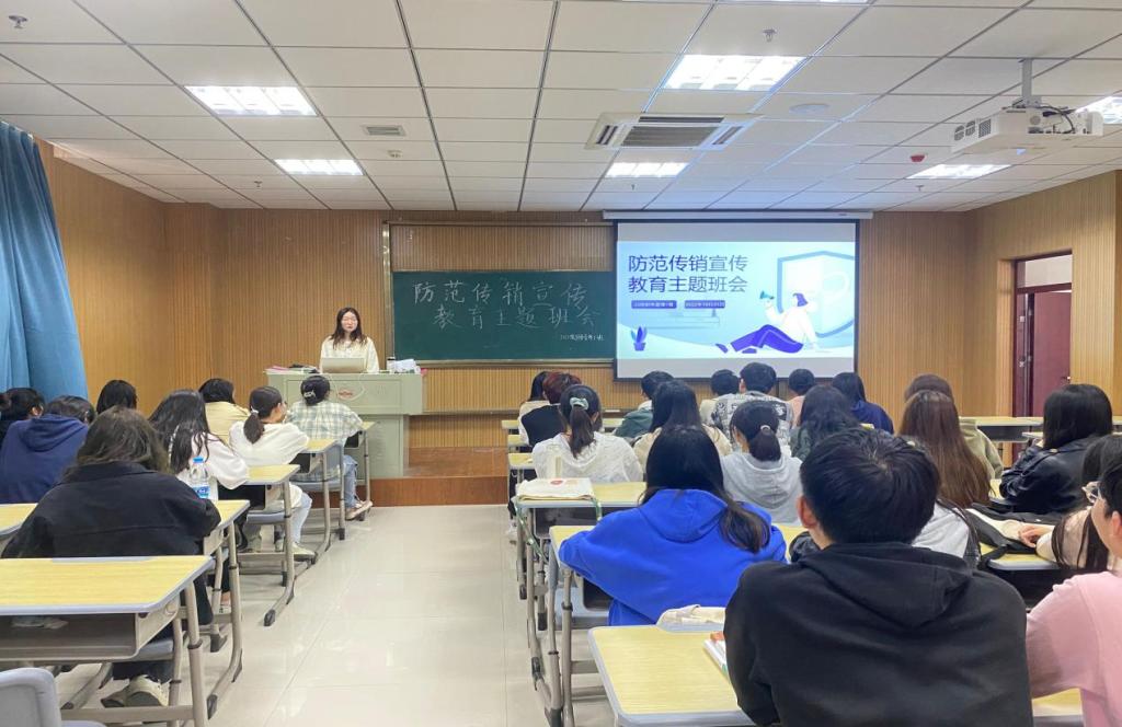 主题班会,强化教育。活动期间学院以班级为单位开展“拒绝传销,净化校园”主题班会,进一步深化反传销宣传教育。通过观看视频、学习宣传资料、师生互动交流等形式,让全体同学进一步认清传销的危害,并表达了远离传销的决心。