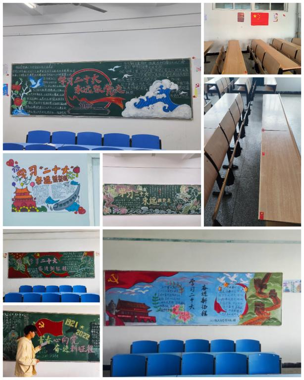 干净整洁的教室环境和温馨典雅的寝室环境是同学们健康成长的必要条件,为此学院举办了“双室设计大赛”。大赛期间,同学们充分利用自己的空闲时间开动脑力,努力使自己的寝室小窝变得温馨而又舒适。各个寝室风格多样,整洁的地面、整齐的被子、温馨的装饰、和谐的氛围,充分展现了同学们对寝室的热爱。活动期间,各班还精心布置教室,以“学习党的二十大”为主题进行板报设计展示。同学们别出心裁的黑板报引人注目,各色各样的手抄报尽显风采,将党的二十大精神聚于笔尖,写出自身感悟,让同学们更深刻学习领悟党的二十大精神。