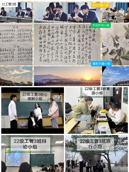 据了解,通过一系列的精心筹划与科学准备,我院部分新生班级的学习小组、书法诗作小组、摄影小组......正有条不紊地展开。其中各班构建以学习小组为纽带的“自主学习—小组学习—班集体学习”的互助学习模式,进一步推动班风、学风建设。