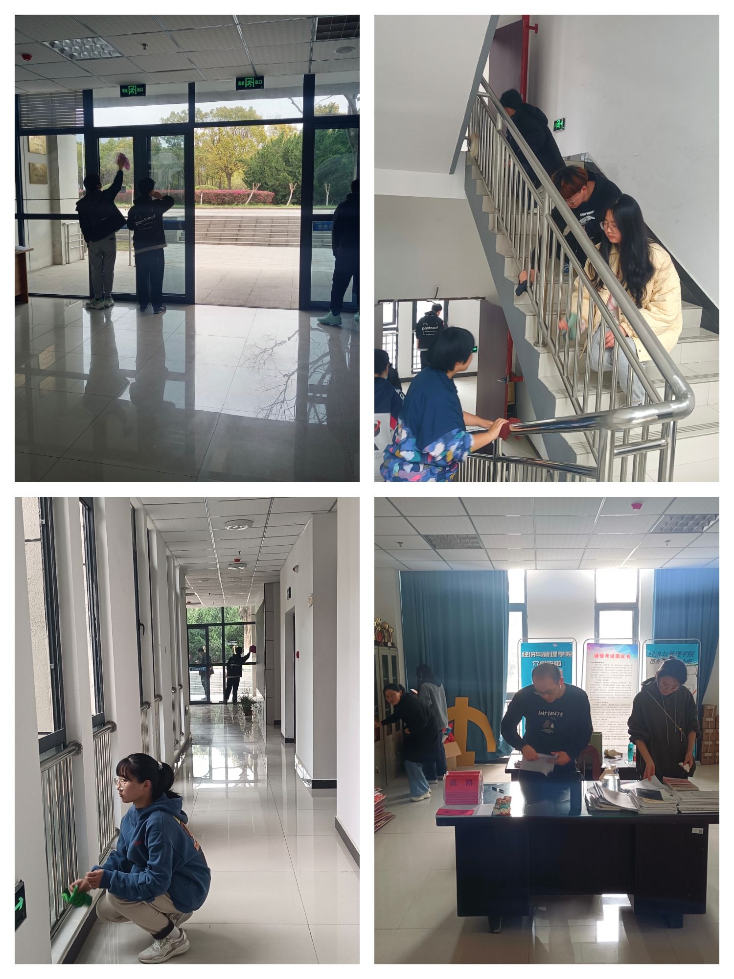 志愿者同学们在教学楼物业人员带领下,分别前往对应负责区域清扫。同学们们手持抹布、扫帚、拖布等清洁工具,井然有序地擦桌子、擦黑板、扫地、清理垃圾等。志愿者们不怕苦,不怕累,他们一个个忙碌的身影在教室里、楼道里穿梭。历经两个小时的努力,教室变得干干净净,楼道的地板一尘不染,看着自己的劳动成果,同学们都露出了欣慰的笑容。