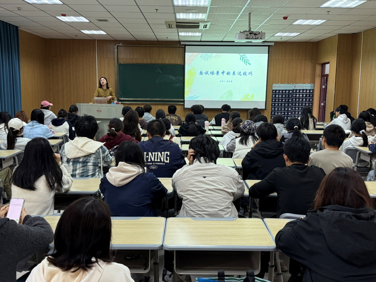 讲座过程中,陈漫雪穿插多个真实面试案例进行现场演示,将抽象的理论知识转化为具体可操作的实用技巧,互动氛围热烈,同学们认真记录、积极思考。尾声环节,她鼓励大家将表达技巧融入日常练习,在反复实践中打磨语言能力,用精准表达传递自身价值与潜力。