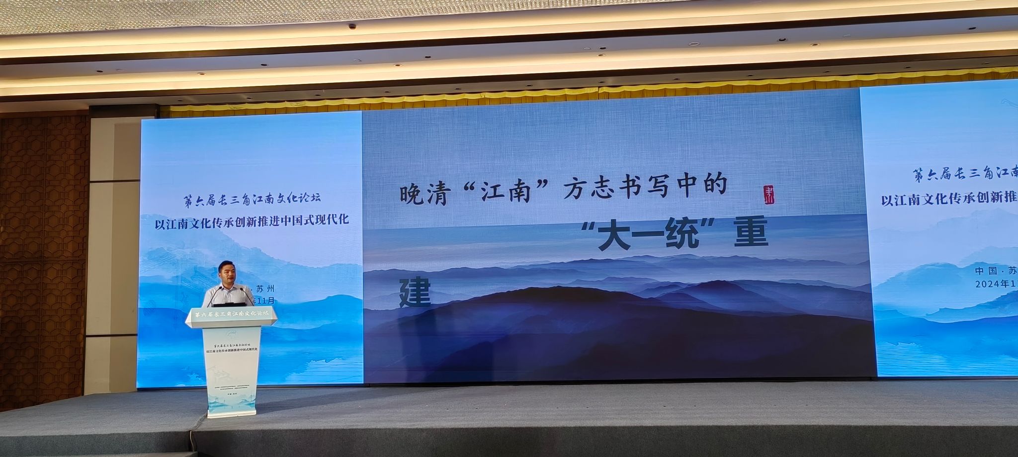 聚焦“以江南文化传承创新推进中国式现代化”主题,来自长三角三省一市的近百位江南文化研究学者、专家就江南文化在新时代的传承与创新路径做研讨交流,探析江南文化对于地方经济发展与社会建设的影响。叶当前担任论坛“江南文化与地方文化融合”专题研讨会主持人,周毅作了《晚清“江南”方志书写中的“大一统”重建》主旨报告。