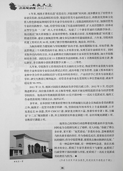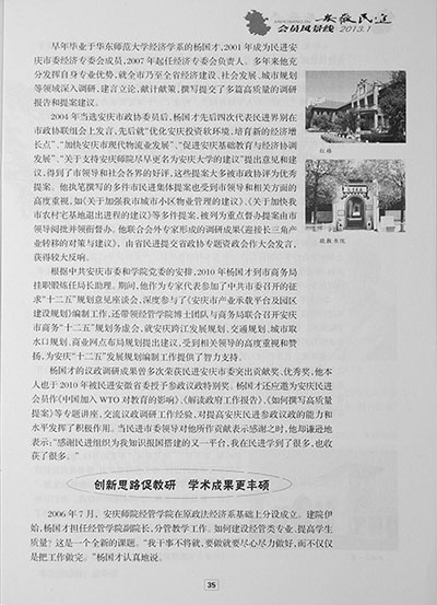 近日,《安徽民进》杂志以“多岗敬业勇担当”为题大篇幅专文介绍了民进安庆市委常委、安庆市政协常委、我校经济管理学院院长杨国才教授事迹。 文章从杨国才教授发挥专长、深入调研,为安庆市经济社会发展、城市规划建言献策,创新思路促进学院专业建设、教学科研以及自身学术成果等方面介绍了杨国才教授,充分肯定了杨国才教授作为行政管理干部的创新开拓精神和作为一名民主党派成员的责任与担当。