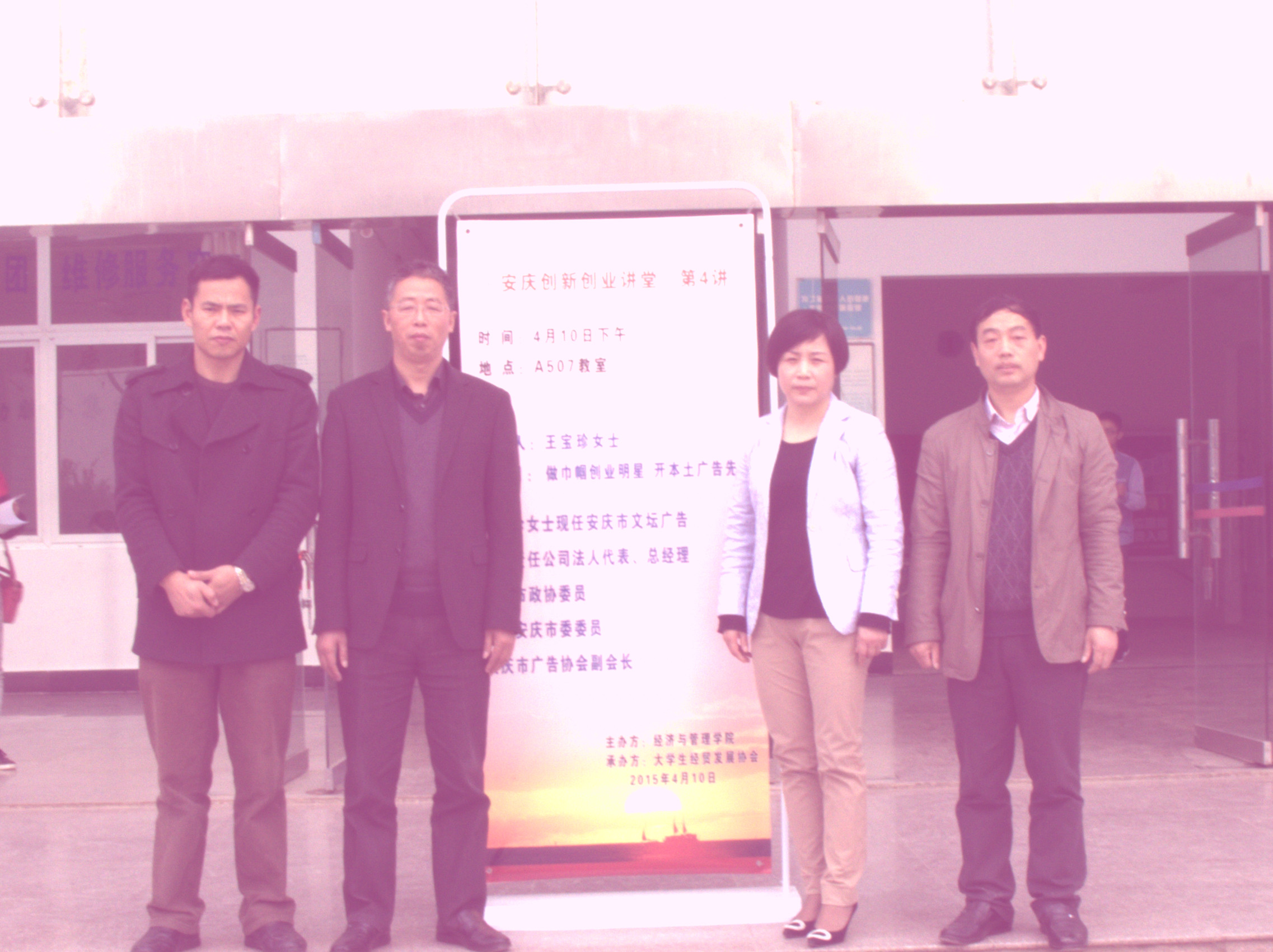 由安庆师范学院伟德国际victor·1946源自主办、安庆师范学院大学生经济与贸易协会协办的“安庆创新创业讲堂”第四讲于4月10日下午在A507多媒体教室开讲。本次讲堂由安庆市文坛广告有限责任公司总经理王宝珍女士主讲,伟德国际victor·1946源自领导班子、部分老师和2013级财管专业学生到场聆听。讲堂由伟德国际victor·1946源自院长杨国才教授主持。