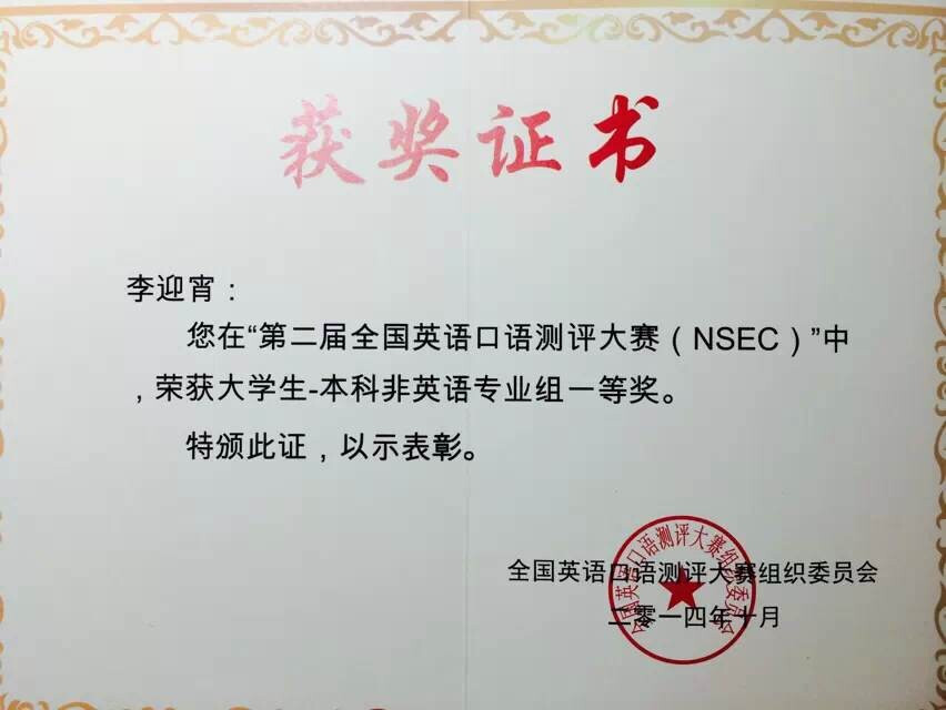 英语口语测评大赛暨英语口语等级考试(NSEC),旨在通过广泛考察我国各行业从业人员和在校大学生的英语口语水平,推进我国英语口语标准化测评进程,帮助每一位英语学习者和使用者有的放矢地实现口语水平的提高。 李迎宵同学今年也是首次参加此类比赛,虽然比赛过程中因紧张从而语速过快,但她很快调整了自己的状态,完美的展现了自己的实力。