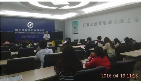国元证券营业部总经理严根荣对经管院一行的到来表示热烈地欢迎。随后,综合及营销主管陈强带领大家参观了各个部门,并向大家介绍了各部门的功能定位及业务特征,对国元证券当前的营业情况和发展态势作了讲解,梅分析师向大家介绍了近几年金融业的发展概况,对证券行业进行了详细讲解,并鼓励学生要学好专业知识,不断提升自己,才能更好的适应社会的发展和行业的要求。