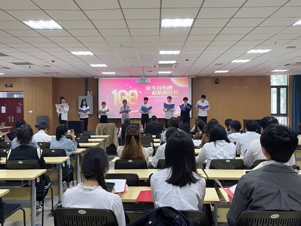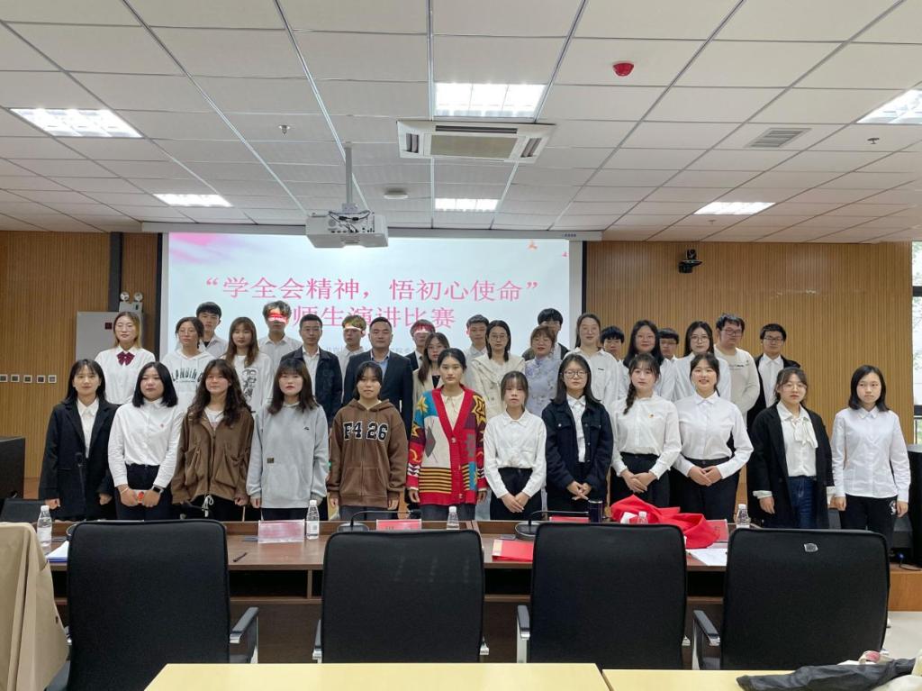 本次演讲活动自5月份启动以来,经各班团支部前期初赛的选拔,近千名同学参与了线上线下活动,最终遴选出由2名青年教师带领30余名同学组成的7支队伍进入决赛。比赛现场,7支队伍紧紧围绕“学全会精神,悟初心使命”这一主题,或娓娓道来,或慷慨激昂,或深情叙述,向观众们展示了一段“有血有肉”的党史,用自己的所思、所想、所感传递着自己对全会精神的感悟。21级金融工程2班以《喜迎二十大,奋进新征程》为题做演讲,强调党员同志要学思践悟,始终将为人民服务铭记于心,落实于行,参赛队伍沉稳自信的状态和生动而感人的演说,赢得了现场评委和观众们的掌声。21级工商管理2班以《百年光辉岁月,奋斗照耀青春》为题,将情景剧融入主题演讲,通过模拟大学宿舍学生畅聊年代更迭,生动对比了100年前的旧时代学堂同新中国现代化教室的巨大差异,这种新颖有趣的方式既让观众们开怀大笑,又真切地感受到在中国共产党的带领下祖国日新月异的变化。“中国人民站起来了!是党的旗帜引领,我们才能战胜风浪,驶过漩涡;在党的旗帜下,我们紧密团结,如钢似铁......”,情景剧中振奋人心的演讲博得了在场观众的阵阵掌声。