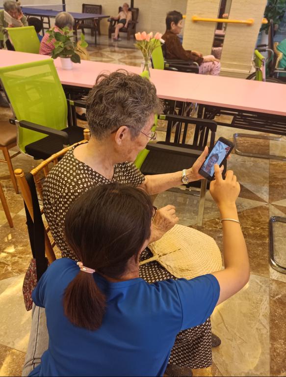 团队成员在护理工作人员的帮助指导下,用轮椅推着十几位老人来到了邻鹿老年护养院公共活动区域,为老人们开展了一场别开生面的课程,让老人体验了视频电话的使用、如何利用手机听黄梅戏听歌看新闻等等。“奶奶,你爱听黄梅戏吗?”“我教你用手机听黄梅戏好不好?”团队成员杜文君了解到安庆是黄梅戏故里,老人们大都有爱听黄梅戏的传统,他希望让这些远离家人陪伴,生活不便的爷爷奶奶们可以通过聆听戏曲使老年生活舒畅。随后团队成员还给老人培训了视频电话的操作,让老人可以随时随地与家人的联系,看到家人的脸庞。