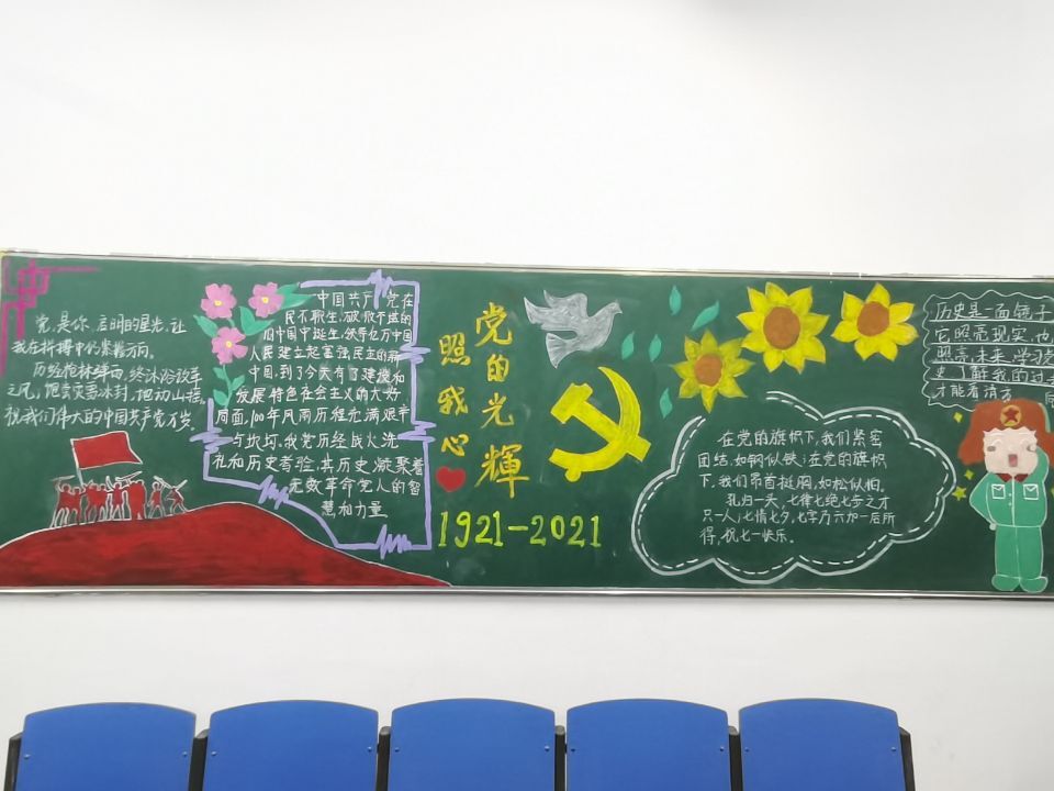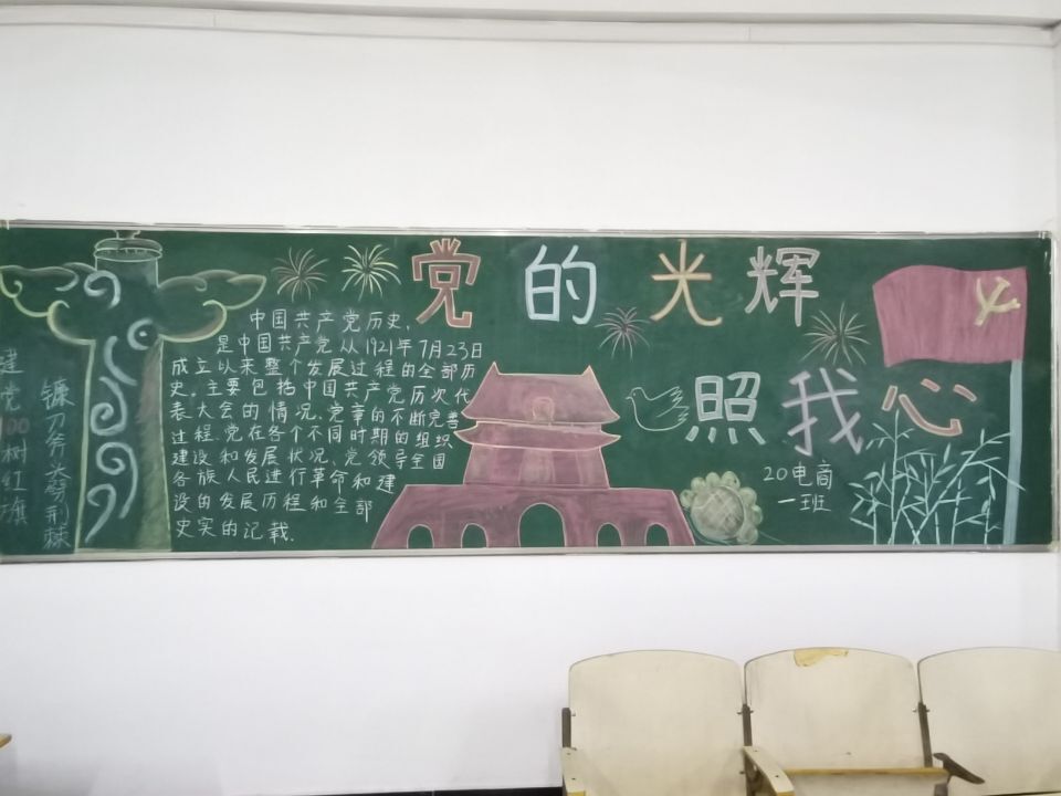 为庆祝中国共产党成立100周年,营造良好的党史学习教育氛围,丰富党史学习教育形式,伟德国际victor·1946源自于6月23日-6月30日组织2020级各班级开展了以“党的光辉照我心”为主题的黑板报评比活动。