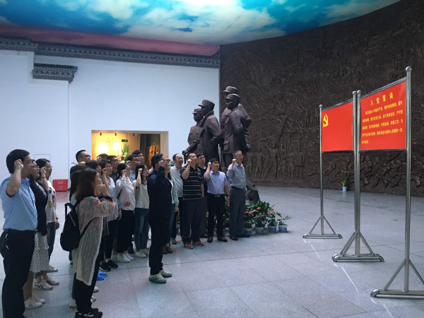 来到新四军史料陈列馆,在新四军革命烈士雕像前,面对鲜艳的中国共产党党旗,全体党员举起右拳庄严宣誓,重温入党誓词。通过讲解员的介绍,大家怀着崇敬的心情观看了珍贵的文献资料、历史图片、实物等,追忆新四军从改编组建到发展壮大的光荣斗争历程,特别是一段段可歌可泣的英雄战史深深震撼着大家的心灵。